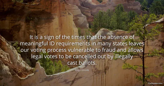 Goode, Virgil. (2026, January 15). It is a sign of the times that the absence of meaningful ID requirements in many states leaves our voting process vulnerable to fraud and allows legal votes to be cancelled out by illegally cast ballots. FixQuotes. https://fixquotes.com/quotes/it-is-a-sign-of-the-times-that-the-absence-of-151567/
