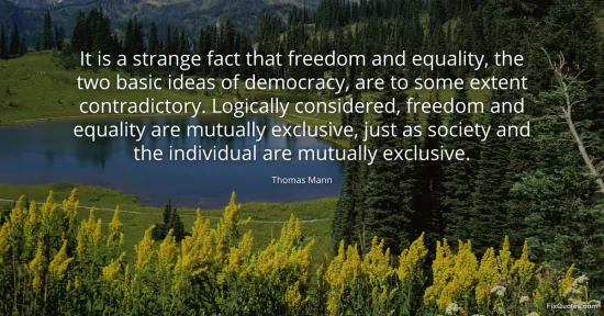 Mann, Thomas. "It is a strange fact that freedom and equality, the two basic ideas of democracy, are to some extent contradictory. Logically considered, freedom and equality are mutually exclusive, just as society and the individual are mutually exclusive." FixQuotes. January 18, 2026. https://fixquotes.com/quotes/it-is-a-strange-fact-that-freedom-and-equality-11647/.