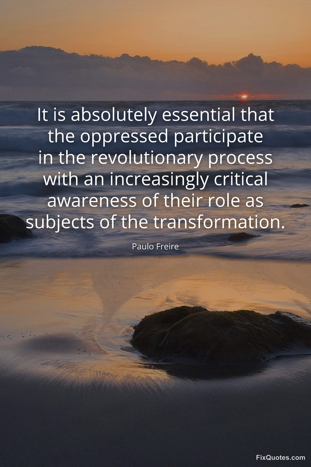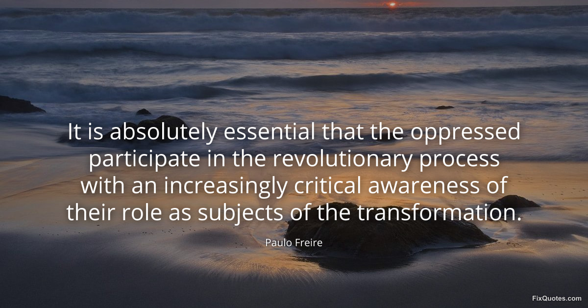 Freire, Paulo. (2026, January 15). It is absolutely essential that the oppressed participate in the revolutionary process with an increasingly critical awareness of their role as subjects of the transformation. FixQuotes. https://fixquotes.com/quotes/it-is-absolutely-essential-that-the-oppressed-163670/
