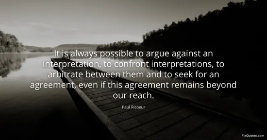 Ricoeur, Paul. "It is always possible to argue against an interpretation, to confront interpretations, to arbitrate between them and to seek for an agreement, even if this agreement remains beyond our reach." FixQuotes. January 18, 2026. https://fixquotes.com/quotes/it-is-always-possible-to-argue-against-an-2855/.