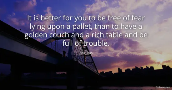 Epicurus. "It is better for you to be free of fear lying upon a pallet, than to have a golden couch and a rich table and be full of trouble." FixQuotes. January 15, 2026. https://fixquotes.com/quotes/it-is-better-for-you-to-be-free-of-fear-lying-27202/.