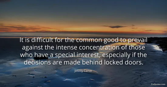 Carter, Jimmy. (2026, January 17). It is difficult for the common good to prevail against the intense concentration of those who have a special interest, especially if the decisions are made behind locked doors. FixQuotes. https://fixquotes.com/quotes/it-is-difficult-for-the-common-good-to-prevail-32036/