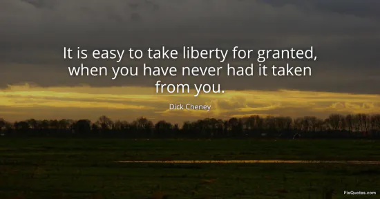 Cheney, Dick. (2026, January 18). It is easy to take liberty for granted, when you have never had it taken from you. FixQuotes. https://fixquotes.com/quotes/it-is-easy-to-take-liberty-for-granted-when-you-17584/