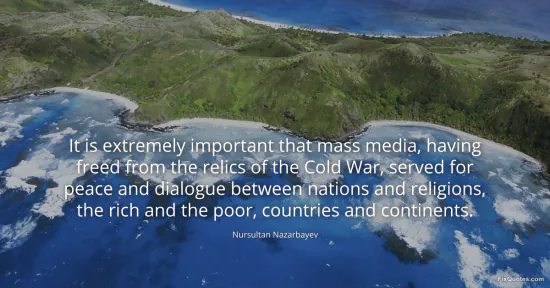 Nazarbayev, Nursultan. (2026, January 15). It is extremely important that mass media, having freed from the relics of the Cold War, served for peace and dialogue between nations and religions, the rich and the poor, countries and continents. FixQuotes. https://fixquotes.com/quotes/it-is-extremely-important-that-mass-media-having-101099/