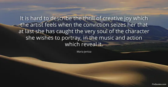 Jeritza, Maria. "It is hard to describe the thrill of creative joy which the artist feels when the conviction seizes her that at last she has caught the very soul of the character she wishes to portray, in the music and action which reveal it." FixQuotes. January 16, 2026. https://fixquotes.com/quotes/it-is-hard-to-describe-the-thrill-of-creative-joy-136403/.