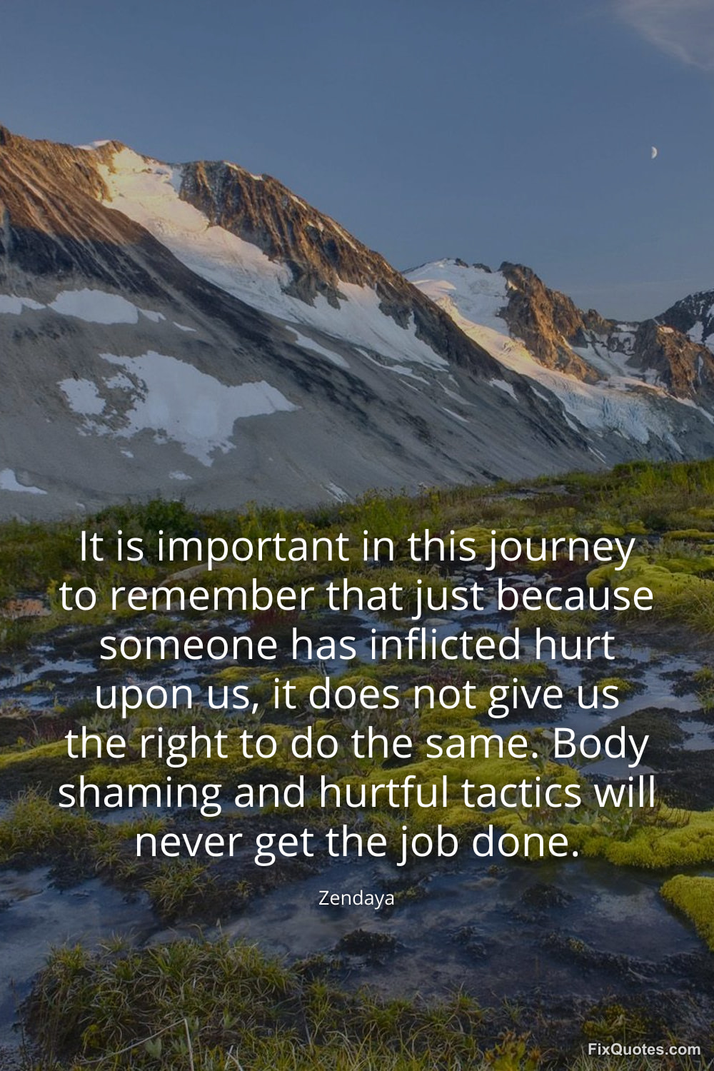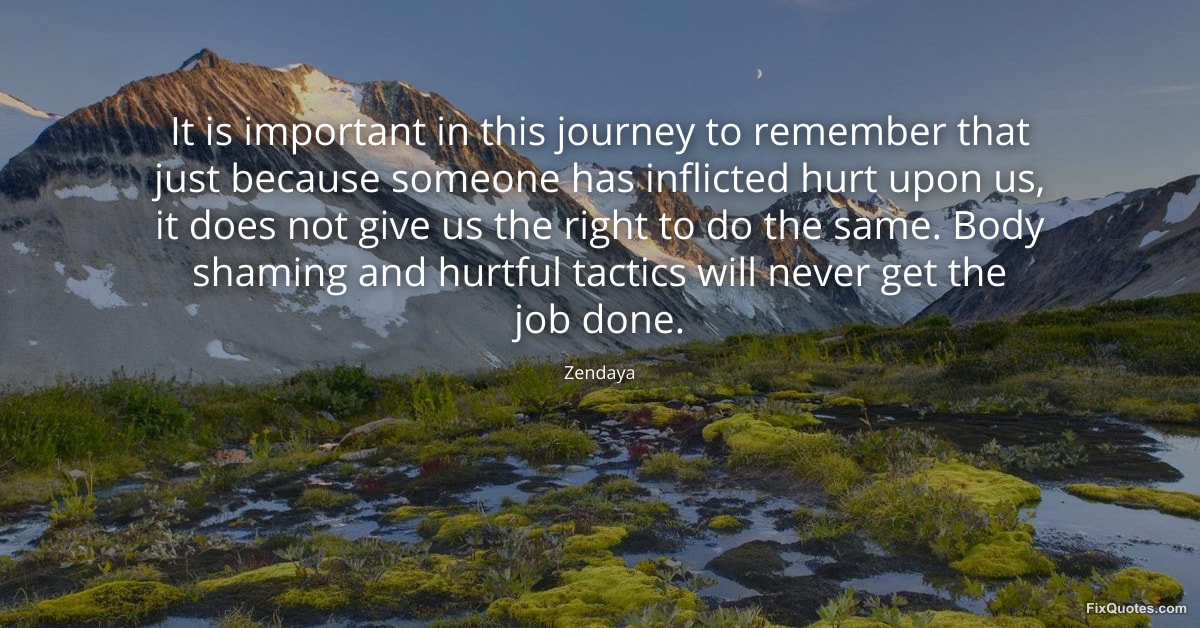Zendaya. "It is important in this journey to remember that just because someone has inflicted hurt upon us, it does not give us the right to do the same. Body shaming and hurtful tactics will never get the job done." FixQuotes. January 30, 2026. https://fixquotes.com/quotes/it-is-important-in-this-journey-to-remember-that-184684/.