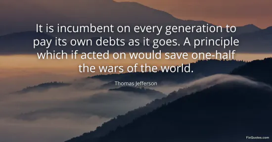 Jefferson, Thomas. (2026, January 18). It is incumbent on every generation to pay its own debts as it goes. A principle which if acted on would save one-half the wars of the world. FixQuotes. https://fixquotes.com/quotes/it-is-incumbent-on-every-generation-to-pay-its-22032/