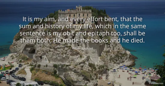 Faulkner, William. "It is my aim, and every effort bent, that the sum and history of my life, which in the same sentence is my obit and epitaph too, shall be them both: He made the books and he died." FixQuotes. January 18, 2026. https://fixquotes.com/quotes/it-is-my-aim-and-every-effort-bent-that-the-sum-11190/.