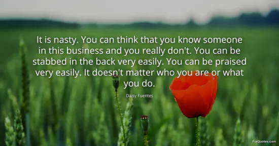 Fuentes, Daisy. (2026, January 17). It is nasty. You can think that you know someone in this business and you really don't. You can be stabbed in the back very easily. You can be praised very easily. It doesn't matter who you are or what you do. FixQuotes. https://fixquotes.com/quotes/it-is-nasty-you-can-think-that-you-know-someone-52298/