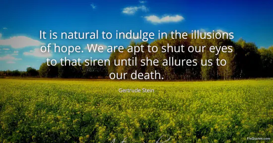 Stein, Gertrude. (2026, January 17). It is natural to indulge in the illusions of hope. We are apt to shut our eyes to that siren until she allures us to our death. FixQuotes. https://fixquotes.com/quotes/it-is-natural-to-indulge-in-the-illusions-of-hope-35046/