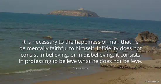 Paine, Thomas. "It is necessary to the happiness of man that he be mentally faithful to himself. Infidelity does not consist in believing, or in disbelieving, it consists in professing to believe what he does not believe." FixQuotes. January 17, 2026. https://fixquotes.com/quotes/it-is-necessary-to-the-happiness-of-man-that-he-23983/.