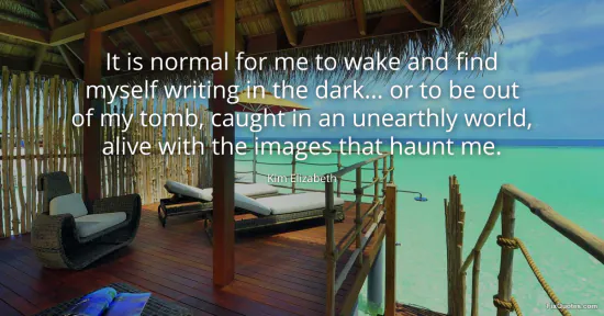 Elizabeth, Kim. "It is normal for me to wake and find myself writing in the dark... or to be out of my tomb, caught in an unearthly world, alive with the images that haunt me." FixQuotes. January 15, 2026. https://fixquotes.com/quotes/it-is-normal-for-me-to-wake-and-find-myself-112445/.