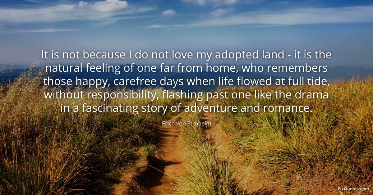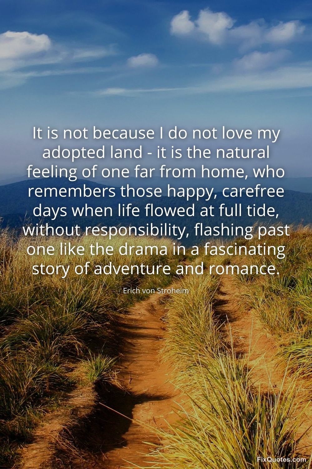 Stroheim, Erich von. "It is not because I do not love my adopted land - it is the natural feeling of one far from home, who remembers those happy, carefree days when life flowed at full tide, without responsibility, flashing past one like the drama in a fascinating story of adventure and romance." FixQuotes. January 18, 2026. https://fixquotes.com/quotes/it-is-not-because-i-do-not-love-my-adopted-land-4297/.