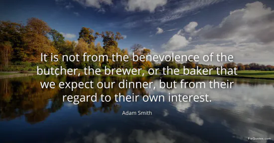 Smith, Adam. "It is not from the benevolence of the butcher, the brewer, or the baker that we expect our dinner, but from their regard to their own interest." FixQuotes. January 17, 2026. https://fixquotes.com/quotes/it-is-not-from-the-benevolence-of-the-butcher-the-29529/.