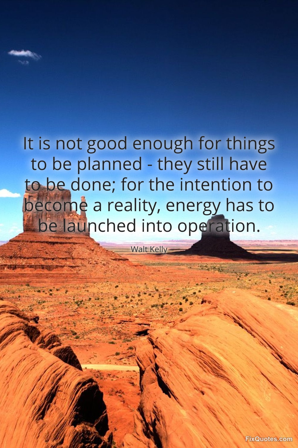 Kelly, Walt. "It is not good enough for things to be planned - they still have to be done; for the intention to become a reality, energy has to be launched into operation." FixQuotes. January 16, 2026. https://fixquotes.com/quotes/it-is-not-good-enough-for-things-to-be-planned-104351/.