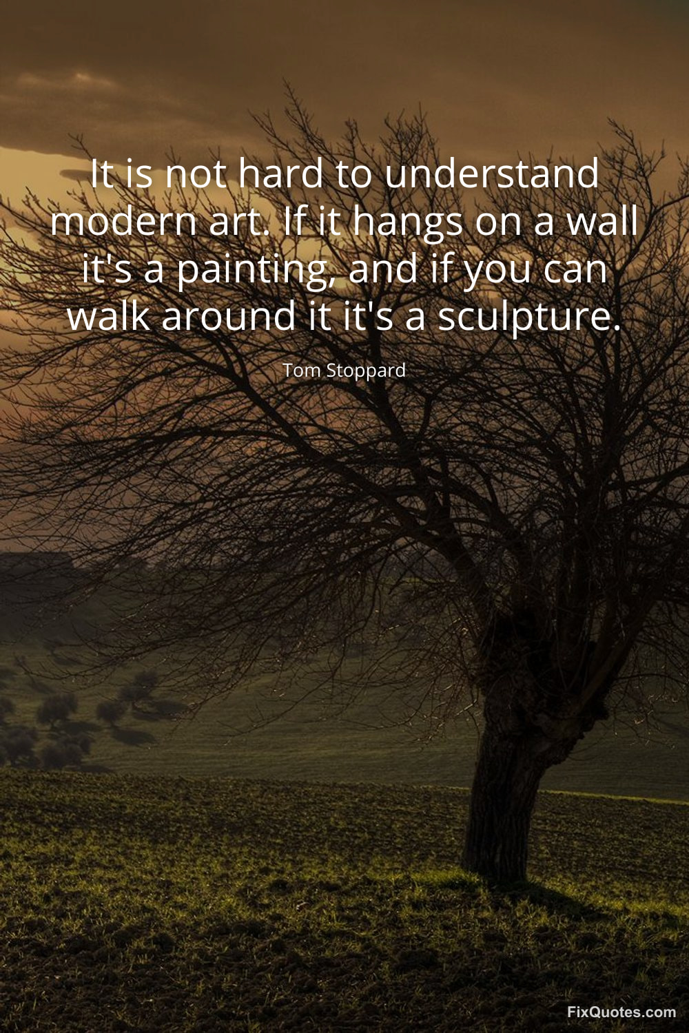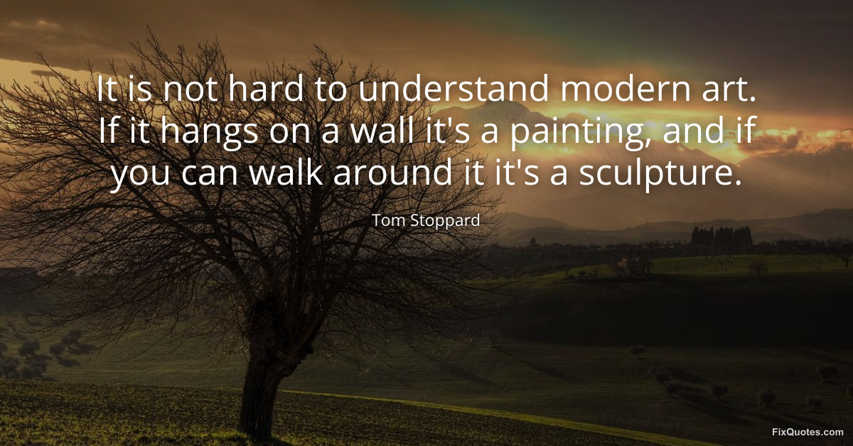 Stoppard, Tom. (2026, January 14). It is not hard to understand modern art. If it hangs on a wall it's a painting, and if you can walk around it it's a sculpture. FixQuotes. https://fixquotes.com/quotes/it-is-not-hard-to-understand-modern-art-if-it-27686/