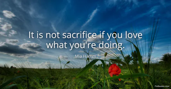 Mia Hamm collapses the space between sacrifice and joy, arguing that when passion and purpose align, the hard parts do not feel like loss. Hours in the weight room, pre-dawn runs, missed parties, the sting of failure and starting again all look like sacrifice from the outside. From the inside, when you care deeply, they become expressions of love, chosen commitments rather than burdens imposed. Love reframes effort: the same exertion that would drain you when done for external rewards becomes energizing when anchored in meaning.