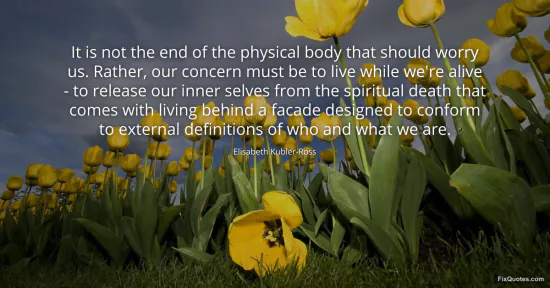 Kubler-Ross, Elisabeth. (2026, January 18). It is not the end of the physical body that should worry us. Rather, our concern must be to live while we're alive - to release our inner selves from the spiritual death that comes with living behind a facade designed to conform to external definitions of who and what we are. FixQuotes. https://fixquotes.com/quotes/it-is-not-the-end-of-the-physical-body-that-2968/