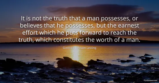 Lessing, Gotthold Ephraim. "It is not the truth that a man possesses, or believes that he possesses, but the earnest effort which he puts forward to reach the truth, which constitutes the worth of a man." FixQuotes. January 17, 2026. https://fixquotes.com/quotes/it-is-not-the-truth-that-a-man-possesses-or-47753/.