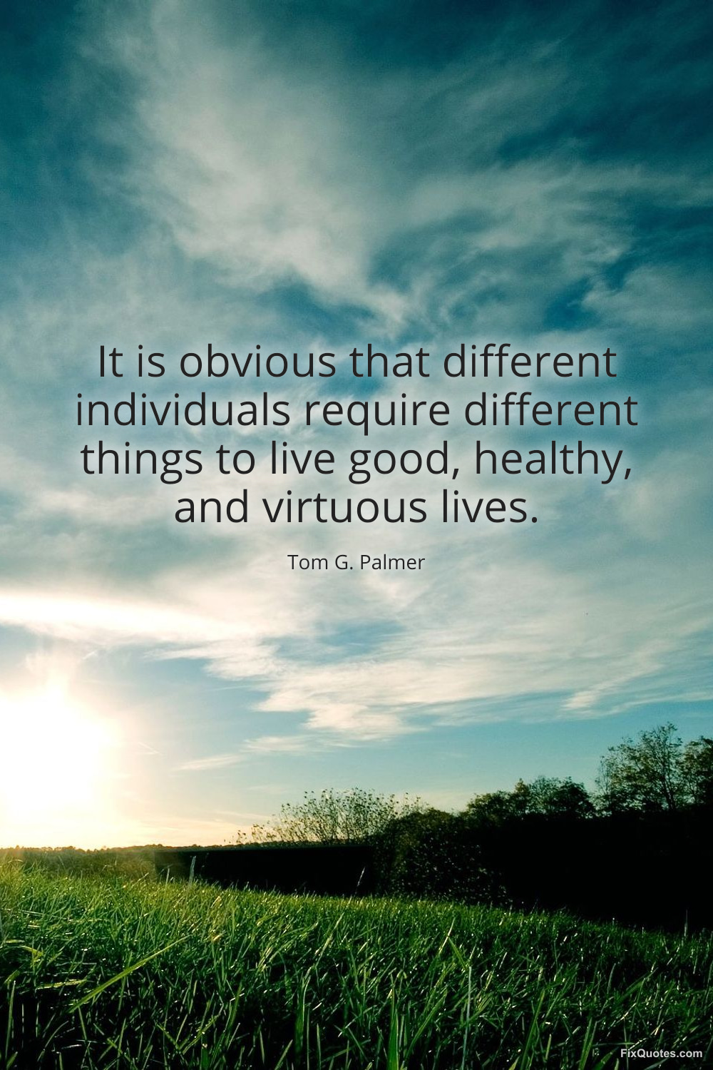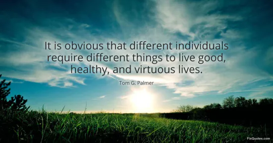Palmer, Tom G. "It is obvious that different individuals require different things to live good, healthy, and virtuous lives." FixQuotes. January 16, 2026. https://fixquotes.com/quotes/it-is-obvious-that-different-individuals-require-86445/.