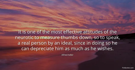 Adler, Alfred. "It is one of the most effective attitudes of the neurotic to measure thumbs down, so to speak, a real person by an ideal, since in doing so he can depreciate him as much as he wishes." FixQuotes. January 18, 2026. https://fixquotes.com/quotes/it-is-one-of-the-most-effective-attitudes-of-the-15447/.