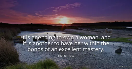 Norman, John. "It is one thing to own a woman, and it is another to have her within the bonds of an excellent mastery." FixQuotes. January 16, 2026. https://fixquotes.com/quotes/it-is-one-thing-to-own-a-woman-and-it-is-another-115656/.