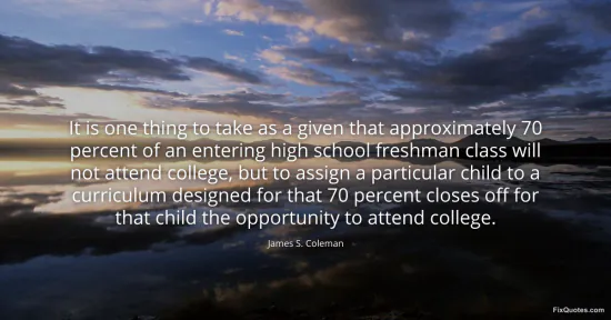 Coleman, James S. "It is one thing to take as a given that approximately 70 percent of an entering high school freshman class will not attend college, but to assign a particular child to a curriculum designed for that 70 percent closes off for that child the opportunity to attend college." FixQuotes. January 18, 2026. https://fixquotes.com/quotes/it-is-one-thing-to-take-as-a-given-that-21571/.