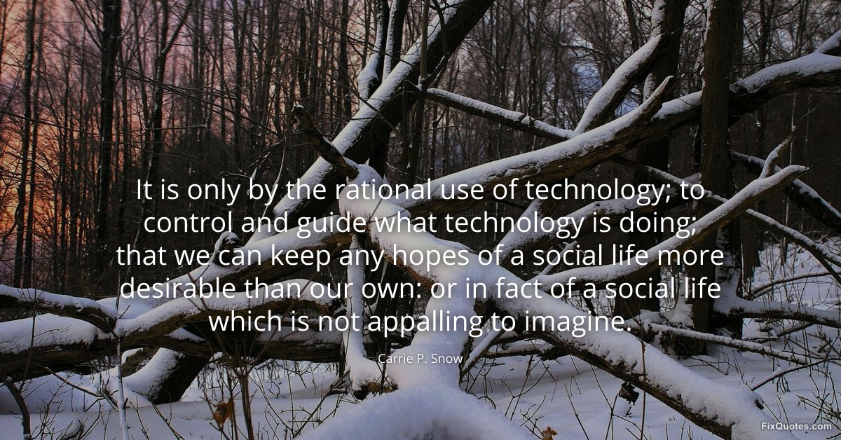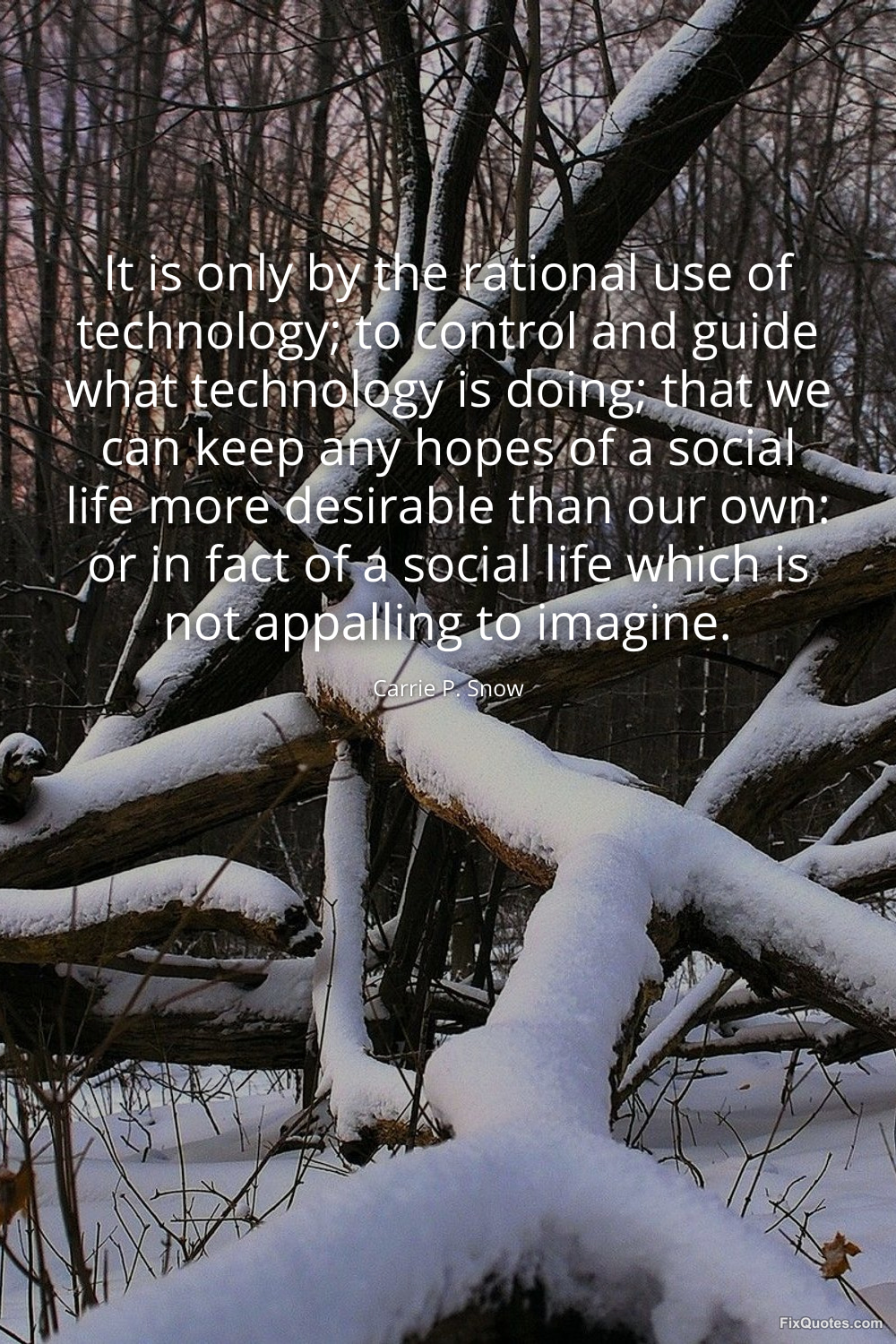 Snow, Carrie P. (2026, January 17). It is only by the rational use of technology; to control and guide what technology is doing; that we can keep any hopes of a social life more desirable than our own: or in fact of a social life which is not appalling to imagine. FixQuotes. https://fixquotes.com/quotes/it-is-only-by-the-rational-use-of-technology-to-44572/