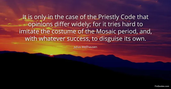 "It is only in the case of the Priestly Code that opinions differ widely; for it tries hard to imitate the costume of the Mosaic period, and, with whatever success, to disguise its own." FixQuotes, 15 Jan. 2026, https://fixquotes.com/quotes/it-is-only-in-the-case-of-the-priestly-code-that-153675/. Accessed 13 Feb. 2026.