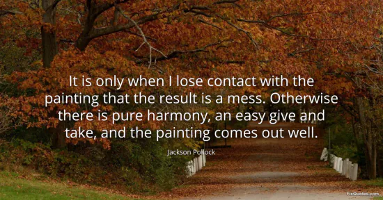Pollock, Jackson. (2026, January 16). It is only when I lose contact with the painting that the result is a mess. Otherwise there is pure harmony, an easy give and take, and the painting comes out well. FixQuotes. https://fixquotes.com/quotes/it-is-only-when-i-lose-contact-with-the-painting-102155/