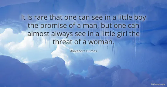Dumas, Alexandre. "It is rare that one can see in a little boy the promise of a man, but one can almost always see in a little girl the threat of a woman." FixQuotes. January 16, 2026. https://fixquotes.com/quotes/it-is-rare-that-one-can-see-in-a-little-boy-the-97184/.