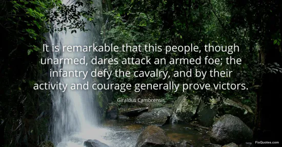 A medieval cleric marveling at battlefield audacity is never just reporting tactics; he is staging a moral lesson with blood on it. Giraldus Cambrensis frames the scene in deliberate imbalance: “this people, though unarmed” versus “an armed foe.” The point isn’t simply that the underdogs win. It’s that the social order implied by arms, armor, and cavalry prestige gets publicly embarrassed by bodies that move faster, take risks, and refuse to accept the script.