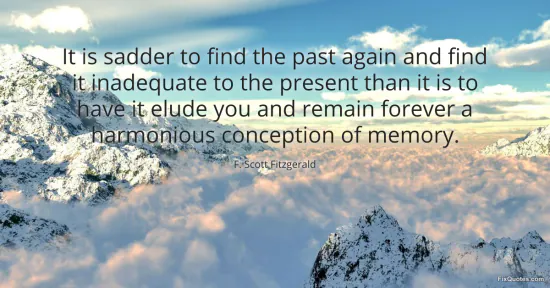 Fitzgerald, F. Scott. "It is sadder to find the past again and find it inadequate to the present than it is to have it elude you and remain forever a harmonious conception of memory." FixQuotes. January 15, 2026. https://fixquotes.com/quotes/it-is-sadder-to-find-the-past-again-and-find-it-19440/.