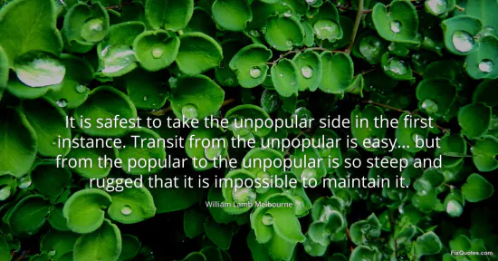 Melbourne, William Lamb. (2026, January 15). It is safest to take the unpopular side in the first instance. Transit from the unpopular is easy... but from the popular to the unpopular is so steep and rugged that it is impossible to maintain it. FixQuotes. https://fixquotes.com/quotes/it-is-safest-to-take-the-unpopular-side-in-the-168714/