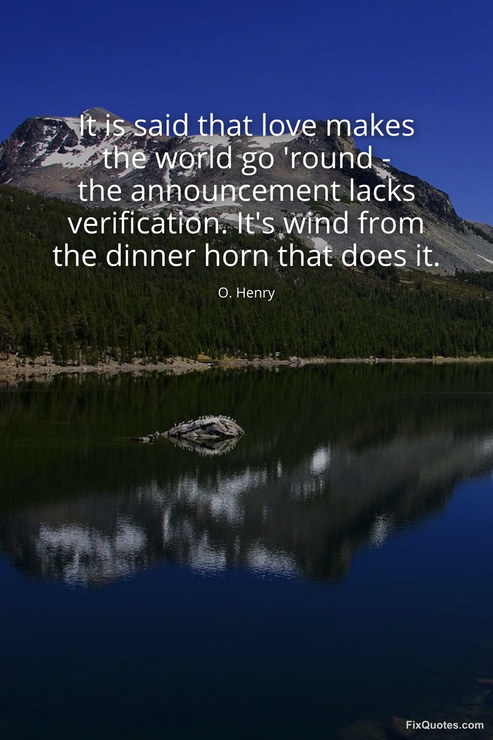 Henry, O. (2026, January 16). It is said that love makes the world go 'round - the announcement lacks verification. It's wind from the dinner horn that does it. FixQuotes. https://fixquotes.com/quotes/it-is-said-that-love-makes-the-world-go-round-86626/