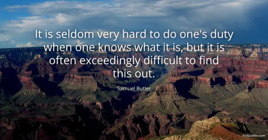 Butler, Samuel. (2026, January 15). It is seldom very hard to do one's duty when one knows what it is, but it is often exceedingly difficult to find this out. FixQuotes. https://fixquotes.com/quotes/it-is-seldom-very-hard-to-do-ones-duty-when-one-18137/