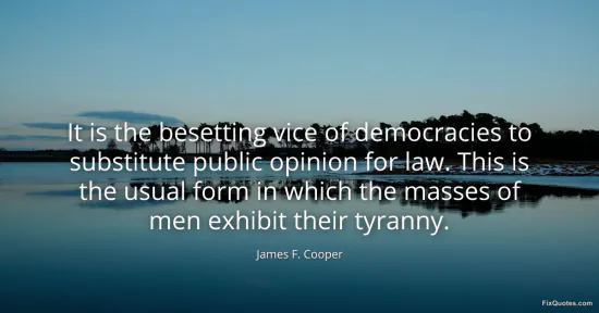 Cooper, James F. "It is the besetting vice of democracies to substitute public opinion for law. This is the usual form in which the masses of men exhibit their tyranny." FixQuotes. January 16, 2026. https://fixquotes.com/quotes/it-is-the-besetting-vice-of-democracies-to-121763/.