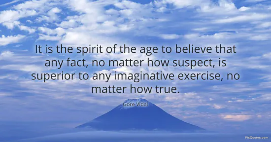 Vidal, Gore. (2026, January 15). It is the spirit of the age to believe that any fact, no matter how suspect, is superior to any imaginative exercise, no matter how true. FixQuotes. https://fixquotes.com/quotes/it-is-the-spirit-of-the-age-to-believe-that-any-82444/
