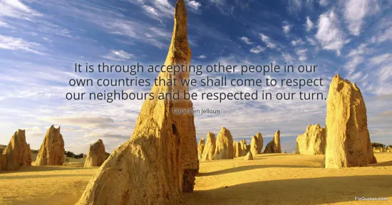 Jelloun, Tahar Ben. (2026, January 16). It is through accepting other people in our own countries that we shall come to respect our neighbours and be respected in our turn. FixQuotes. https://fixquotes.com/quotes/it-is-through-accepting-other-people-in-our-own-95373/