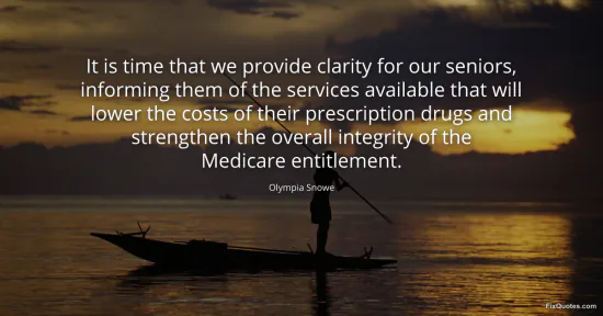 Snowe, Olympia. (2026, January 16). It is time that we provide clarity for our seniors, informing them of the services available that will lower the costs of their prescription drugs and strengthen the overall integrity of the Medicare entitlement. FixQuotes. https://fixquotes.com/quotes/it-is-time-that-we-provide-clarity-for-our-135251/
