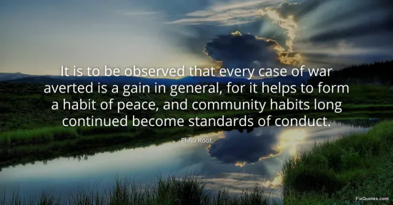 Root, Elihu. (2026, January 15). It is to be observed that every case of war averted is a gain in general, for it helps to form a habit of peace, and community habits long continued become standards of conduct. FixQuotes. https://fixquotes.com/quotes/it-is-to-be-observed-that-every-case-of-war-143295/