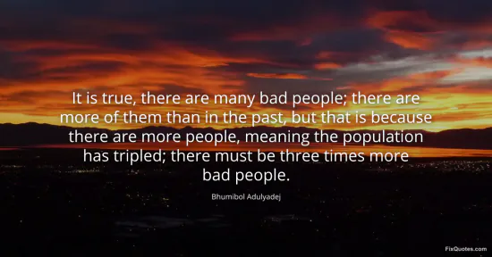 Adulyadej, Bhumibol. "It is true, there are many bad people; there are more of them than in the past, but that is because there are more people, meaning the population has tripled; there must be three times more bad people." FixQuotes. January 16, 2026. https://fixquotes.com/quotes/it-is-true-there-are-many-bad-people-there-are-98259/.