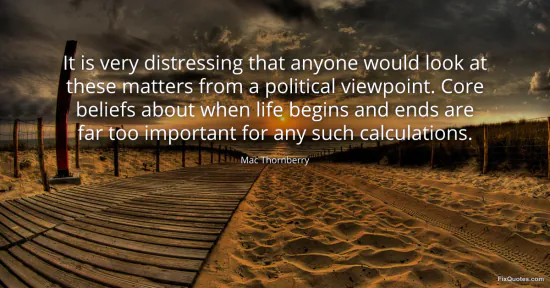 Thornberry, Mac. "It is very distressing that anyone would look at these matters from a political viewpoint. Core beliefs about when life begins and ends are far too important for any such calculations." FixQuotes. January 15, 2026. https://fixquotes.com/quotes/it-is-very-distressing-that-anyone-would-look-at-159016/.