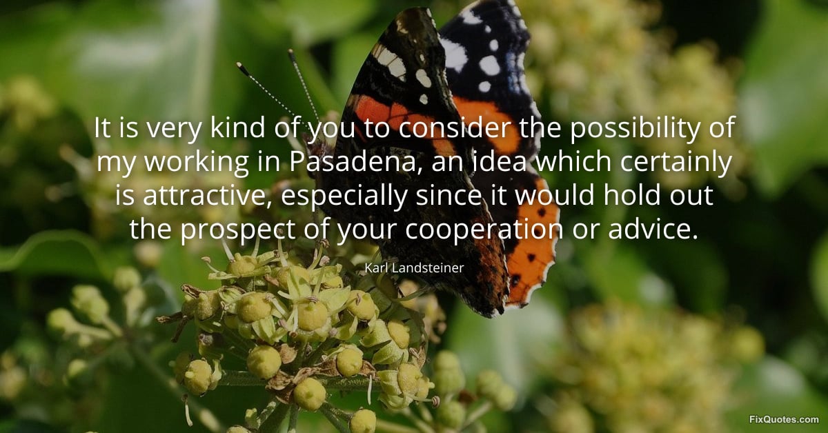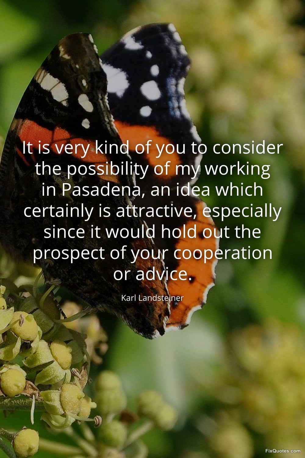 Landsteiner, Karl. "It is very kind of you to consider the possibility of my working in Pasadena, an idea which certainly is attractive, especially since it would hold out the prospect of your cooperation or advice." FixQuotes. January 17, 2026. https://fixquotes.com/quotes/it-is-very-kind-of-you-to-consider-the-70424/.