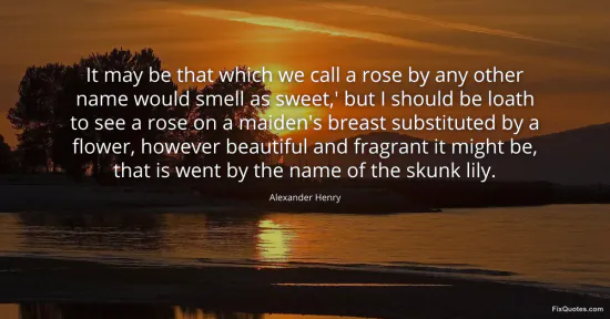Henry, Alexander. (2026, January 17). It may be that which we call a rose by any other name would smell as sweet,' but I should be loath to see a rose on a maiden's breast substituted by a flower, however beautiful and fragrant it might be, that is went by the name of the skunk lily. FixQuotes. https://fixquotes.com/quotes/it-may-be-that-which-we-call-a-rose-by-any-other-40081/