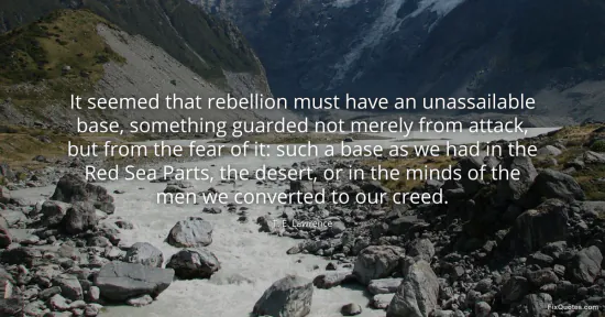 Lawrence, T. E. (2026, January 15). It seemed that rebellion must have an unassailable base, something guarded not merely from attack, but from the fear of it: such a base as we had in the Red Sea Parts, the desert, or in the minds of the men we converted to our creed. FixQuotes. https://fixquotes.com/quotes/it-seemed-that-rebellion-must-have-an-84740/