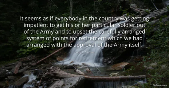 Stimson, Henry L. (2026, January 18). It seems as if everybody in the country was getting impatient to get his or her particular soldier out of the Army and to upset the carefully arranged system of points for retirement which we had arranged with the approval of the Army itself. FixQuotes. https://fixquotes.com/quotes/it-seems-as-if-everybody-in-the-country-was-18864/