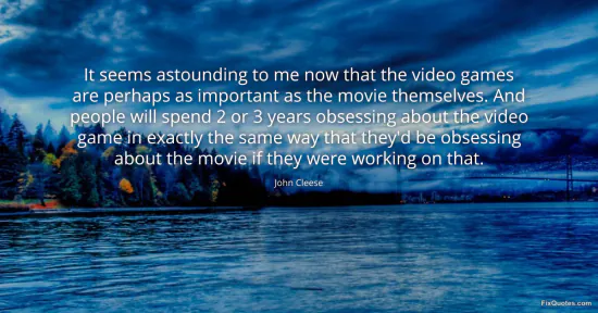 Cleese, John. "It seems astounding to me now that the video games are perhaps as important as the movie themselves. And people will spend 2 or 3 years obsessing about the video game in exactly the same way that they'd be obsessing about the movie if they were working on that." FixQuotes. January 18, 2026. https://fixquotes.com/quotes/it-seems-astounding-to-me-now-that-the-video-5774/.