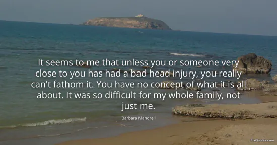 Mandrell, Barbara. (2026, January 16). It seems to me that unless you or someone very close to you has had a bad head injury, you really can't fathom it. You have no concept of what it is all about. It was so difficult for my whole family, not just me. FixQuotes. https://fixquotes.com/quotes/it-seems-to-me-that-unless-you-or-someone-very-131819/