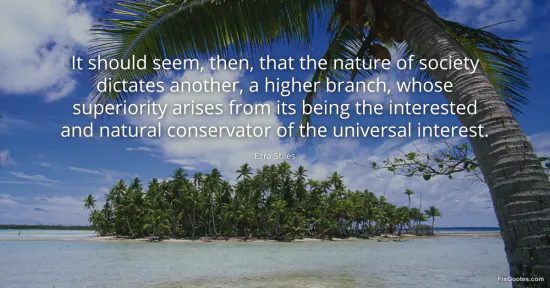 Stiles, Ezra. "It should seem, then, that the nature of society dictates another, a higher branch, whose superiority arises from its being the interested and natural conservator of the universal interest." FixQuotes. January 15, 2026. https://fixquotes.com/quotes/it-should-seem-then-that-the-nature-of-society-140649/.